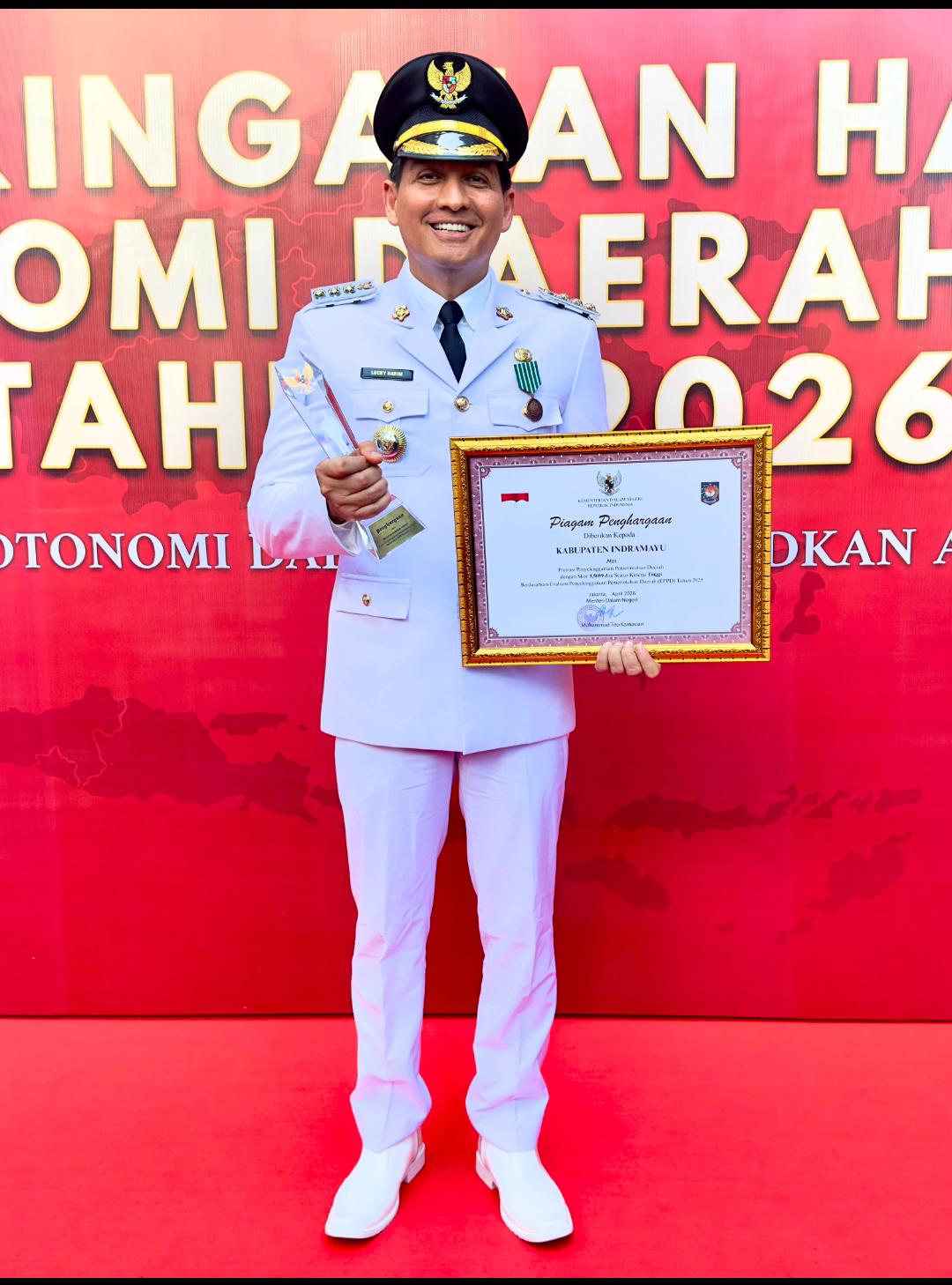 Jakarta, Gantaranews.id – Bupati Indramayu, Lucky Hakim, menerima sertifikat dan piagam penghargaan dari Kementerian Dalam Negeri (Kemendagri) dalam rangka peringatan Hari Otonomi Daerah ke-30 yang digelar di Lapangan Kemendagri, Jakarta, Senin (27/4/2026).